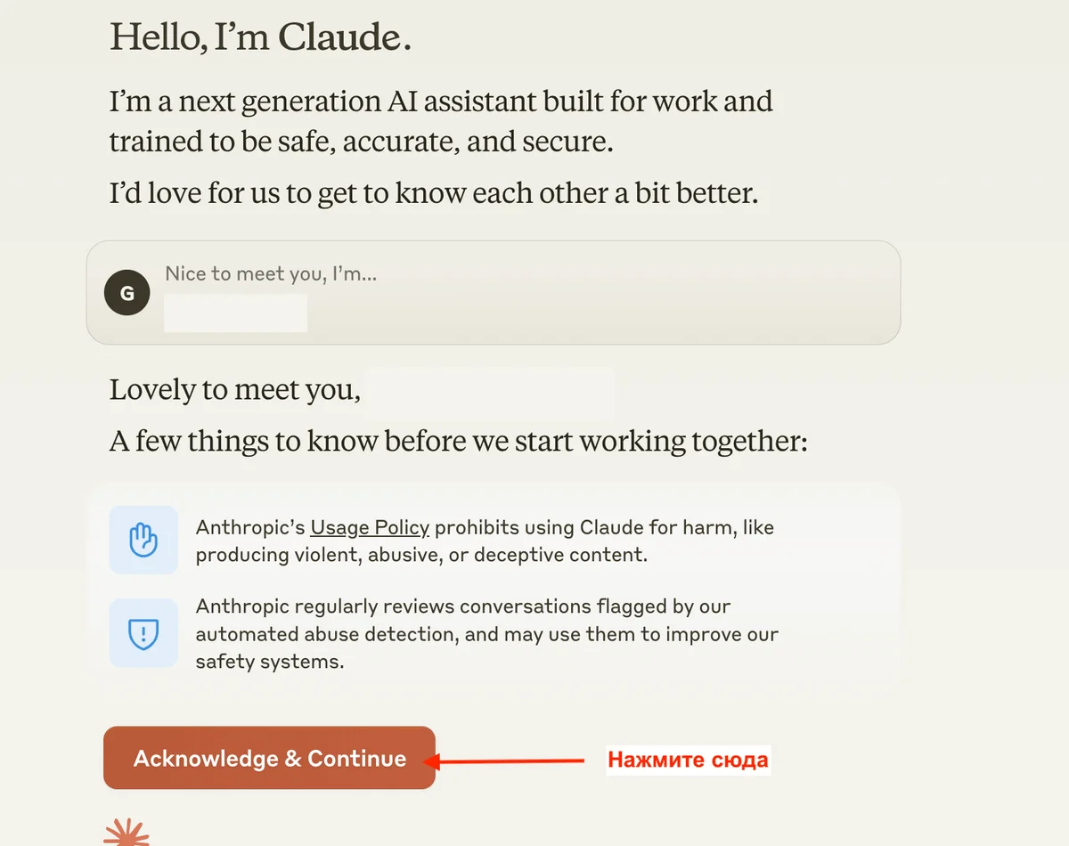 Введите обращение для нейросети. Прочтите предупреждение о том, что Claude нельзя использовать для причинения вреда и преступной деятельности, и нажмите Acknowledge & Continue.