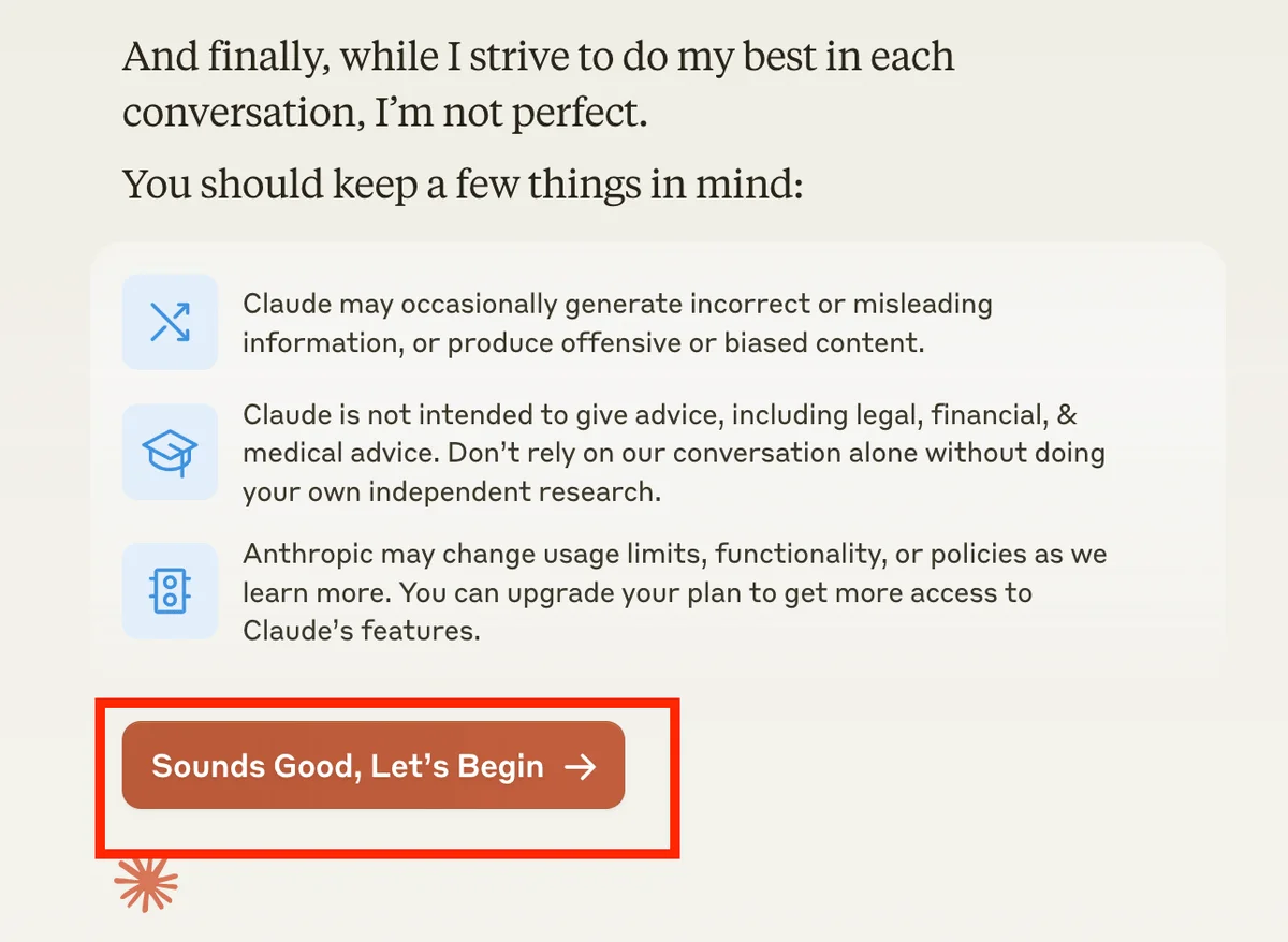 Ознакомьтесь с предупреждениями от разработчиков. Они просят проверять важные факты в контенте, сгенерированном ИИ, и не полагаться на советы нейронки касательно законов, финансов и медицинских вопросов. Еще в уведомлении сказано, что лимиты и функции могут меняться, поэтому стоит ознакомиться с тарифами сервиса. Если со всем согласны, нажмите Sounds Good, Let’s Begin.