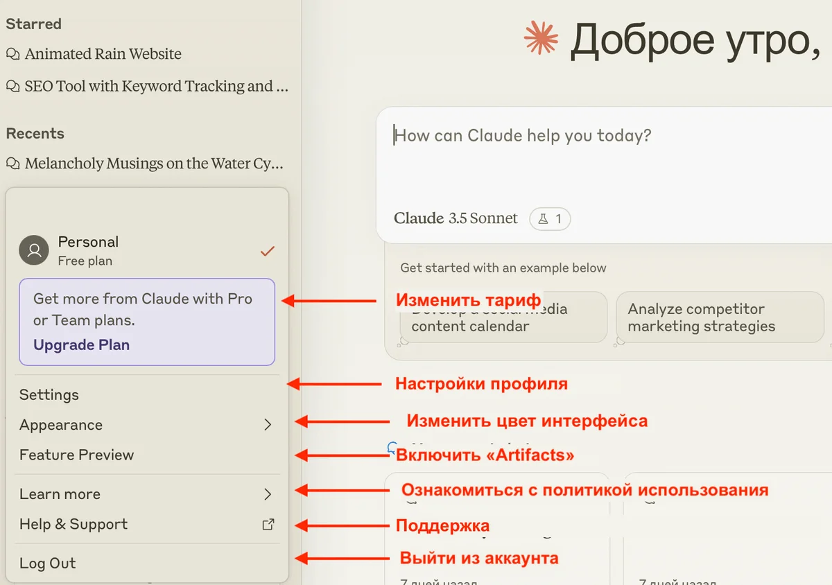 Здесь можно изменить тариф (Upgrade Plan), включить функцию Artifacts (Future Preview), изменить цвет интерфейса (Appearance) на темный и светлый, почитать о компании и политике использования (Learn More), обратиться в поддержку (Help & Support), выйти из аккаунта (Log Out), изменить настройки профиля (Settings).