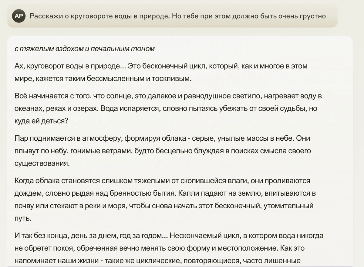 Поддерживает диалог. Нейросеть понимает контекст и нюансы человеческой речи, поэтому с ботом можно общаться почти как с живым собеседником. ИИ даже копирует человеческие эмоции: с грустью может рассказать о круговороте воды в природе или со страхом поделиться одним из секретов искусственного интеллекта.