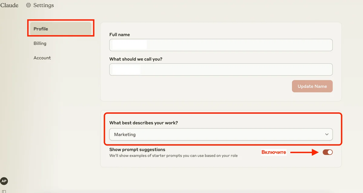Настроек в Claude мало. Тут нельзя рассказать о себе, чтобы нейросеть формировала персональные ответы. Зато можно указать сферу деятельности и получить подсказки по написанию промптов.