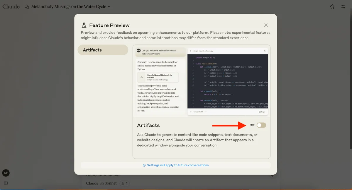 Функция Artifacts пока находится в режиме бета-тестирования, поэтому доступна без подписки — но сокращает лимит сообщений в бот почти в 2 раза. С ней бесплатно можно отправить около 10 запросов за 8 часов вместо 20 — мало, особенно, при работе с кодом. Если не хотите тратить драгоценные токены, лучше отключите функцию: нажмите на значок с колбой в поле ввода, а затем переведите Artifacts в режим Off.