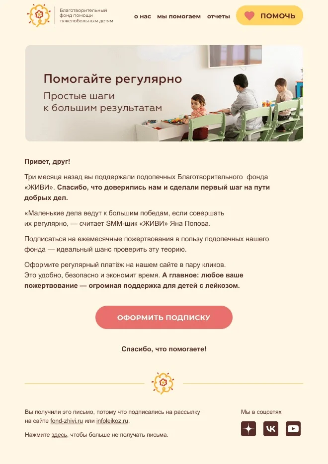В первой части статьи кратко расскажу о том, как в нашей организации работает email-маркетинг, и как мы используем ESP Unisender, email-транспорт Unisender Go, Alerpo DRM. Во второй части коснёмся нетипичной для фонда истории о помощи IT-вендорам.