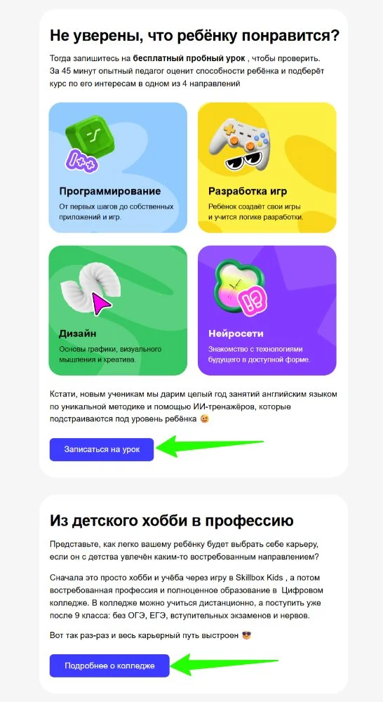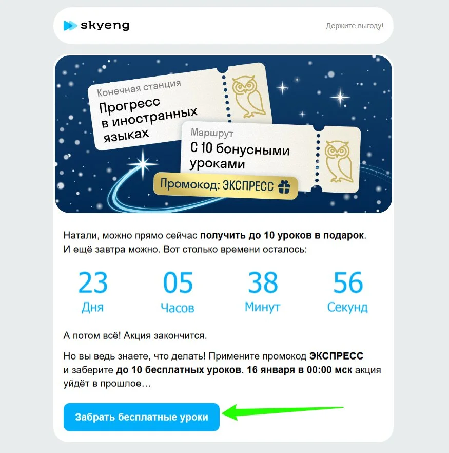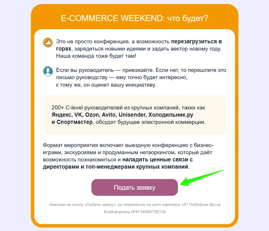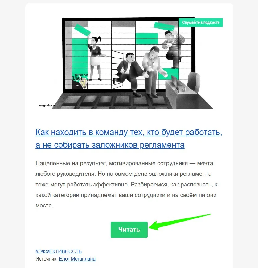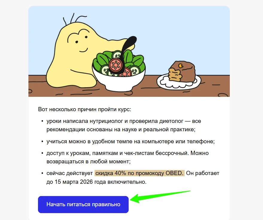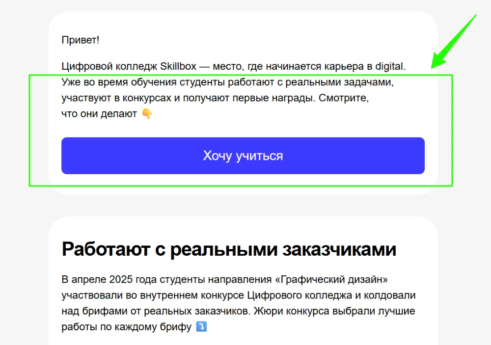 В email-рассылках каждое отправленное письмо преследует какую-то цель в рамках стратегии. Чаще всего она сводится к тому, чтобы побудить получателя совершить нужное действие — кликнуть, перейти на сайт, его конкретный раздел или в соцсети, зарегистрироваться на мероприятие. И вот здесь результат зависит от того, как выглядит призыв к действию (CTA). Этот элемент должен мотивировать к продолжению взаимодействия — иначе магии не случится.