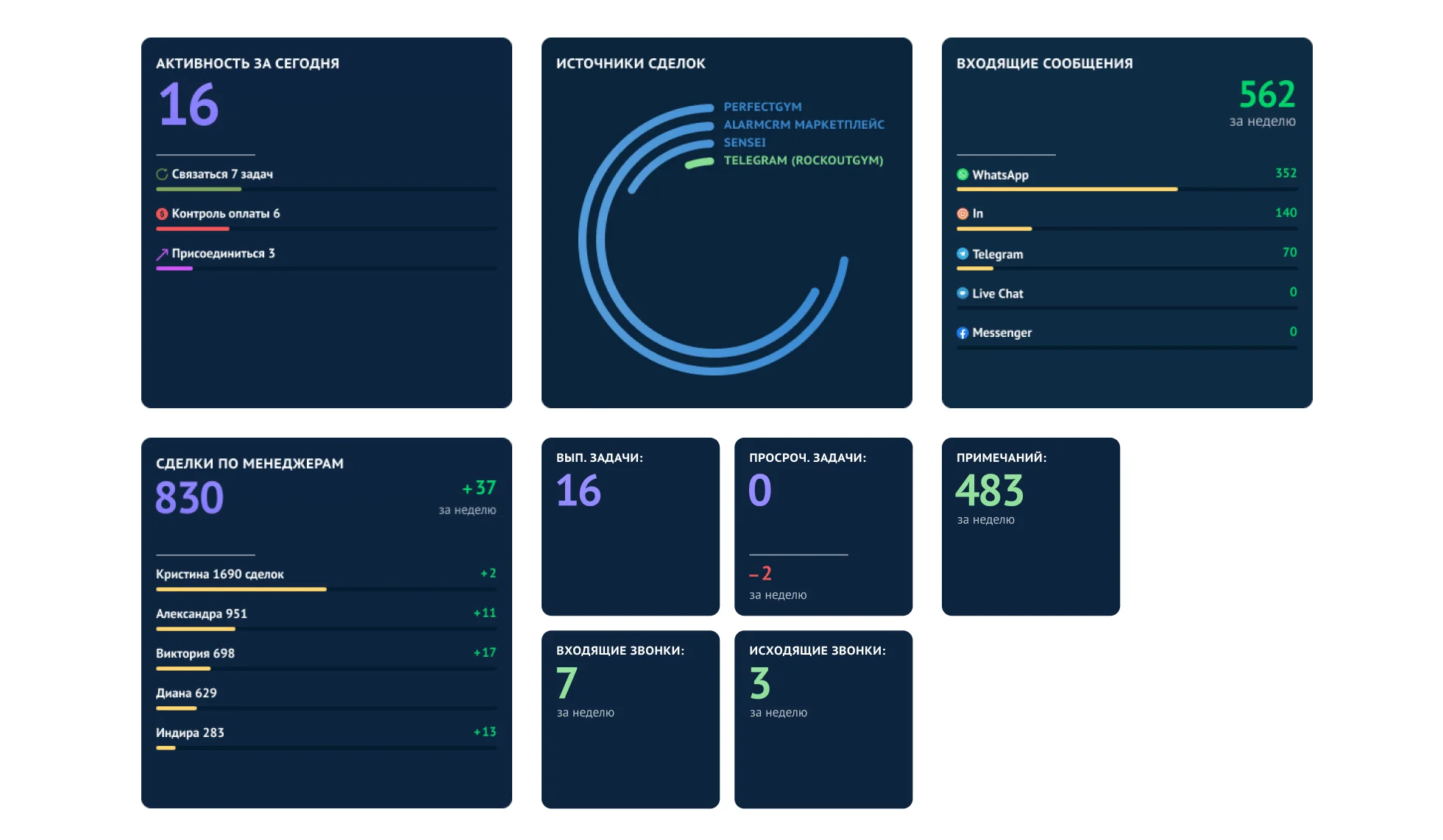 Пример мониторинга эффективности сотрудников. В CRM-системе Alarm-CRM есть дашборд, который показывает, сколько сделок закрыл конкретный менеджер, также откуда приходило больше всего заявок. По дашборду картинка складывается лучше, чем просто в цифрах.