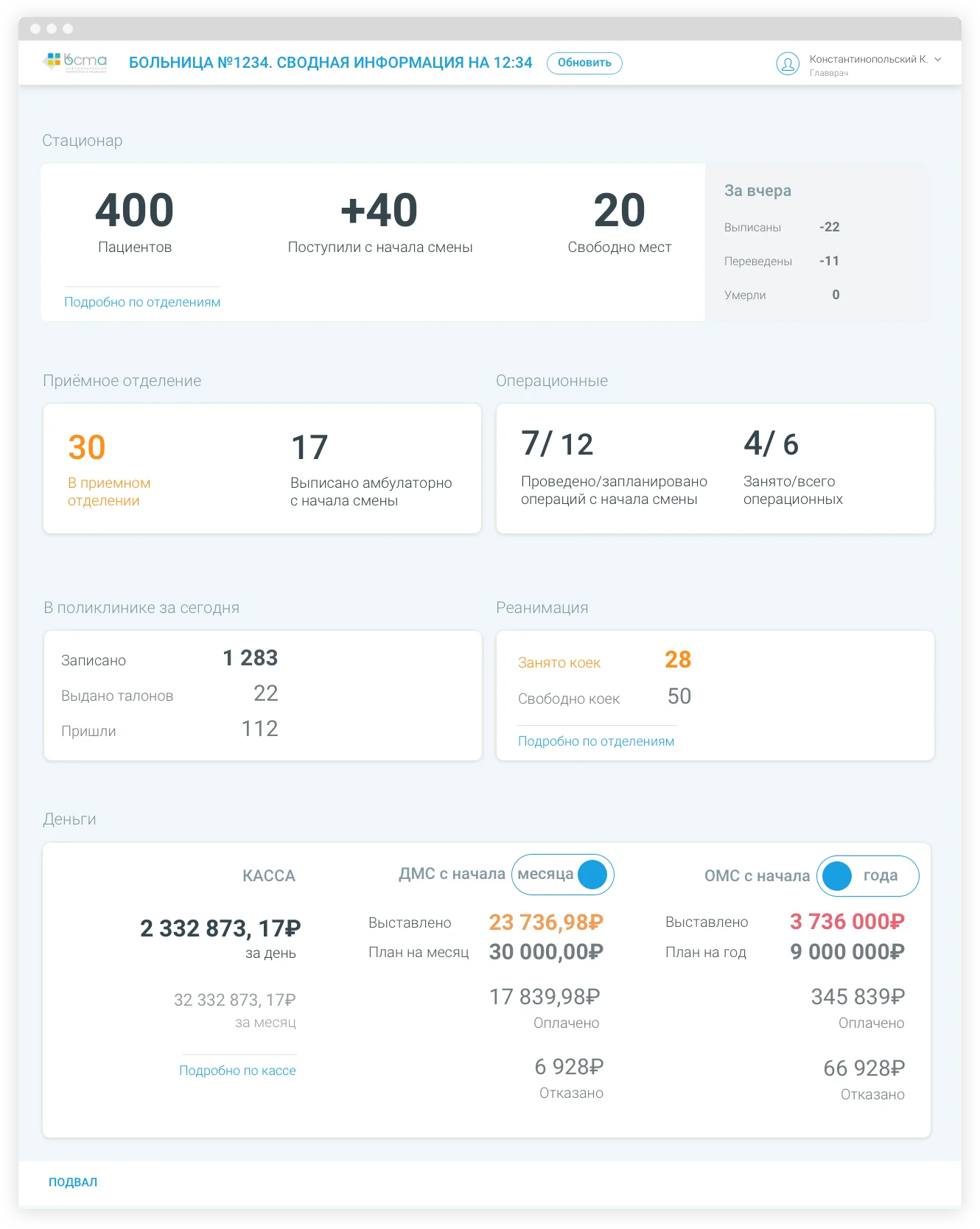 Пример дашборда больницы о загрузке пациентами. На таком дашборде руководитель может видеть загрузку, число свободных мест и изменения кассового прихода.