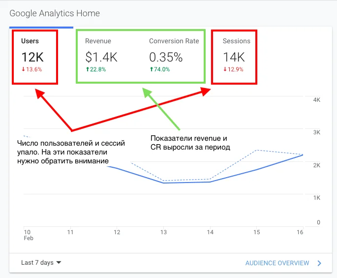 Получать оперативную информацию о динамике показателей. На той же главной странице GA маркетолог наблюдает изменения показателя трафика в разрезе 7 дней.
