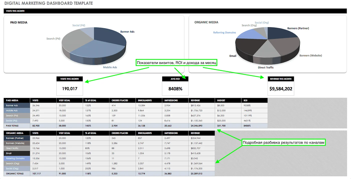 Для простейших дашбордов маркетолог может использовать таблицы. Для построения понадобится собрать данные, настроить подсчёт с помощью формул и сводных таблиц, вывести необходимые диаграммы, графики и показатели на отдельный лист.