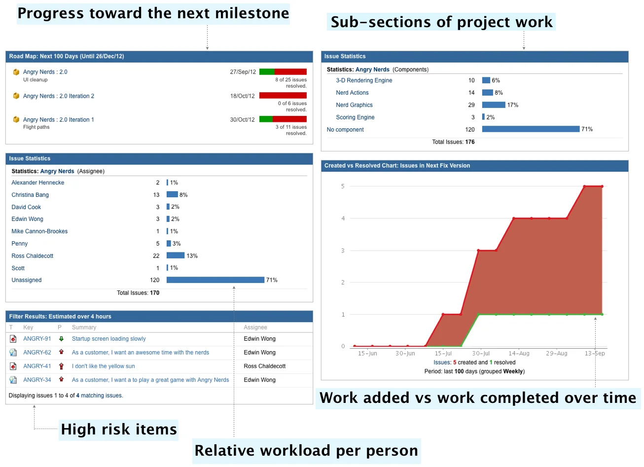 Пример из Jira. Дашборд показывает статус, прогресс версий, дату начала и окончания, описание релиза. Посмотрев такой дашборд, руководитель понимает историю выпусков, может оценить загрузку команды.