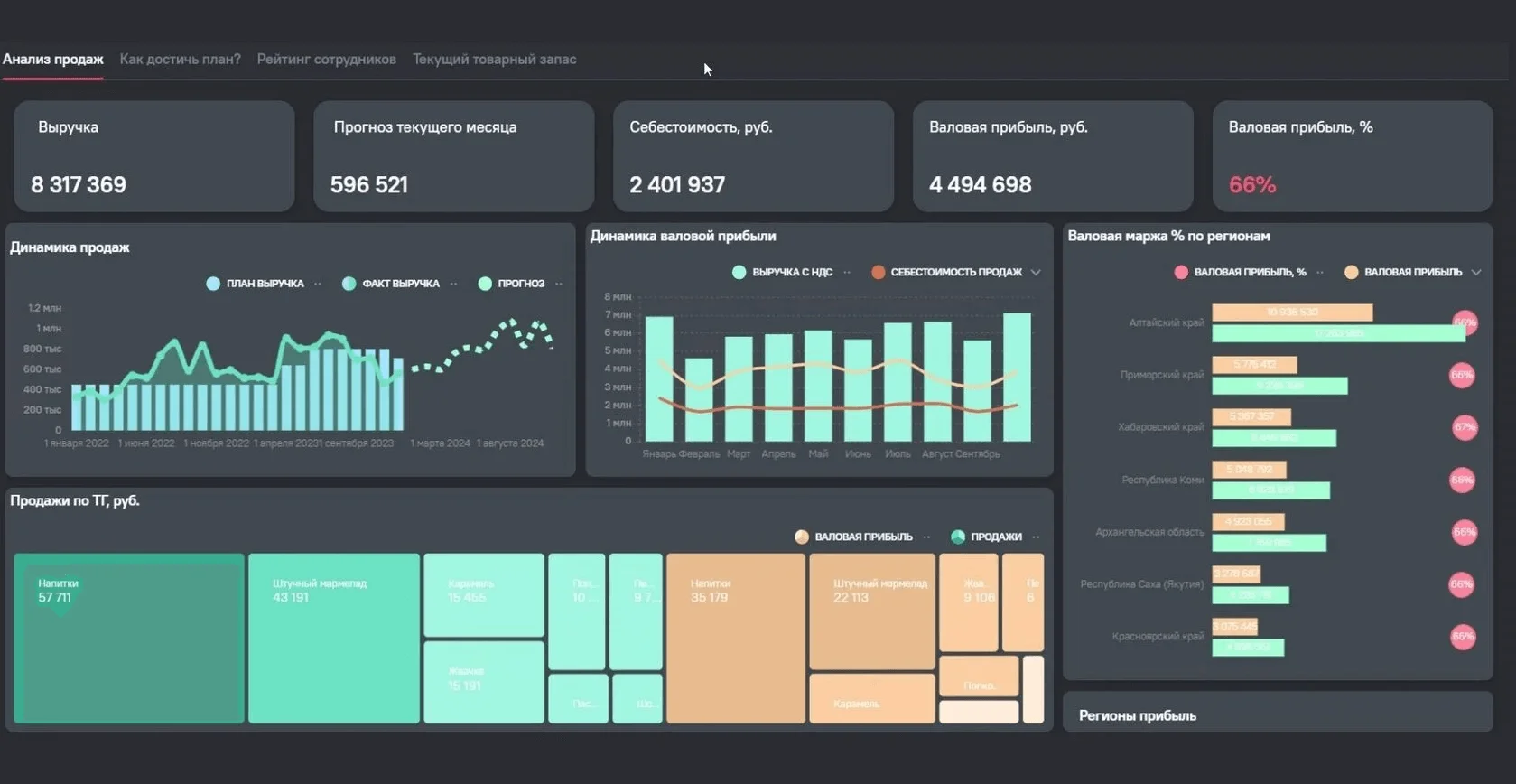 Пример по выплатам сотрудникам для HR. Здесь дашборд показывает сумму зарплат работникам в разрезе пола, возраста, подразделения. Дашборд использует форматы круговых и точечных диаграмм, гистограмм.