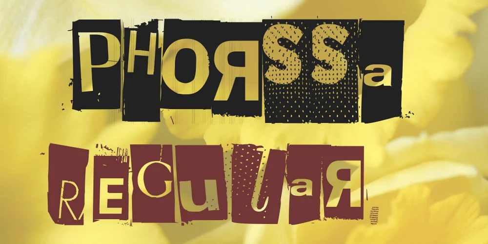 Phorssa сразу бросается в глаза своим эклектичным и бунтарским дизайном. Он состоит из разрозненных букв — каждая будто вырезана со страницы журнала. Этот эффект создает ощущение хаотичности и динамики, стилистика напоминает панк-рок или уличное искусство.