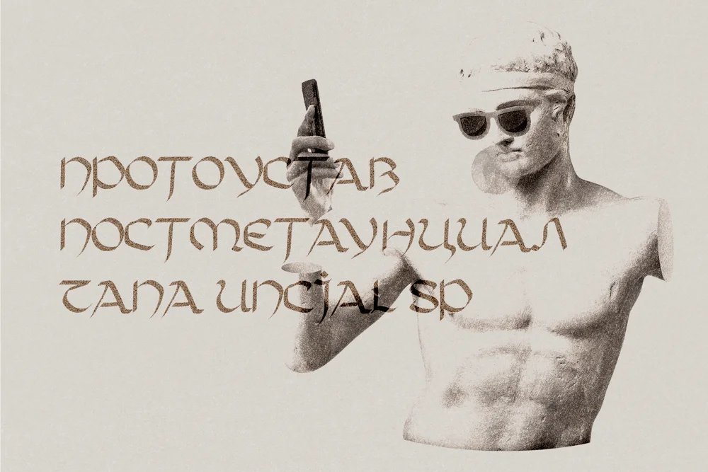 Этот шрифт привлекает внимание отсылками к Древней Греции. У него плавные, закругленные формы букв, которые характерны для письма IV — IX вв. Буквы Tana Uncial SP «мягкие», с текучими линиями, элегантными засечками и выносными элементами.