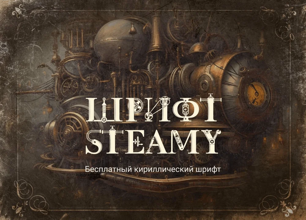 Steamy — шрифт, который вдохновлен эстетикой стимпанка. В его буквах сочетаются элементы механизмов, шестеренок и труб, что создает эффект индустриального дизайна XIX века. Каждый символ выглядит как часть сложного устройства.