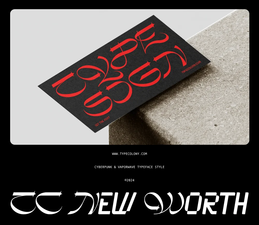 В шрифте есть нотки киберпанка. У букв футуристические формы с плавными линиями и острыми углами. Контуры символов напоминают технологические узоры и неоновые вывески, что придает надписям современный вид. TC New Worth будет уместен на сайте дизайн-студии или в названии лимитированной коллекции одежды онлайн-бутика.