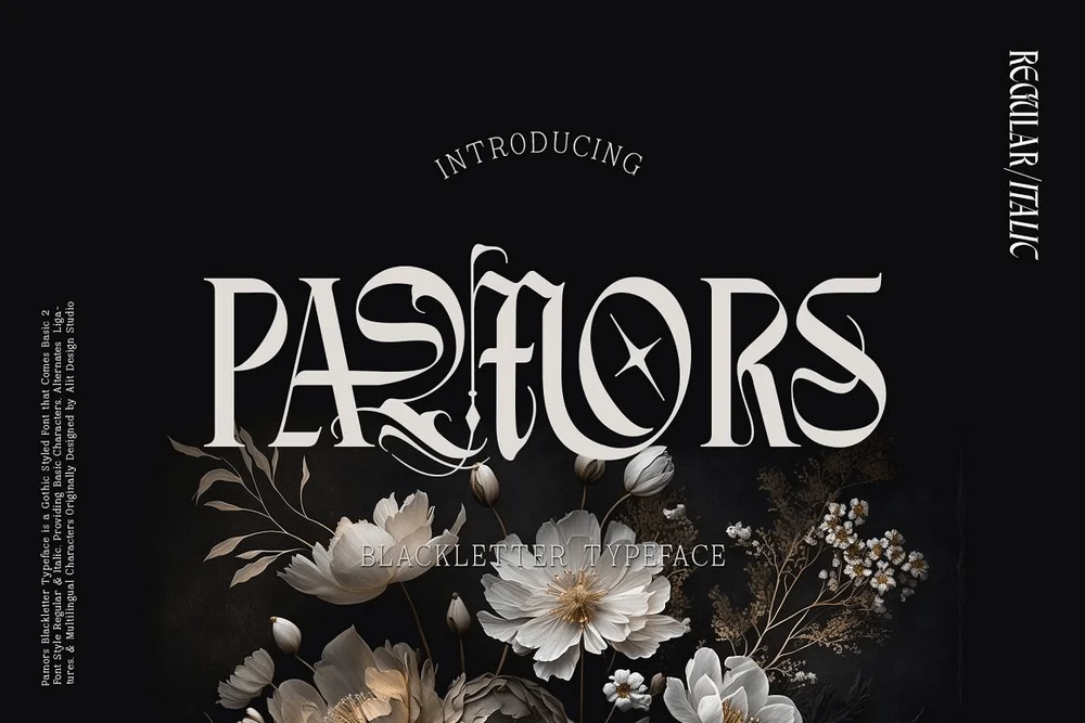 Шрифт в готическом стиле выделяется элегантностью и изяществом. У него сложные изгибы, декоративные элементы и плавные переходы, что придает буквам уникальность и утонченность. Pamors сочетает в себе традиционные готические формы с современными дизайнерскими акцентами.