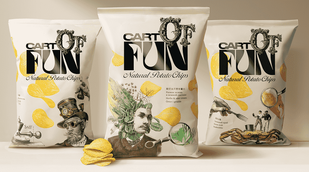 Дизайн упаковки чипсов CartOfFun: 4 разных шрифта и сюрреалистичные картинки. Вычурность шрифта в сочетании с ироничным названием привлекают внимание.
