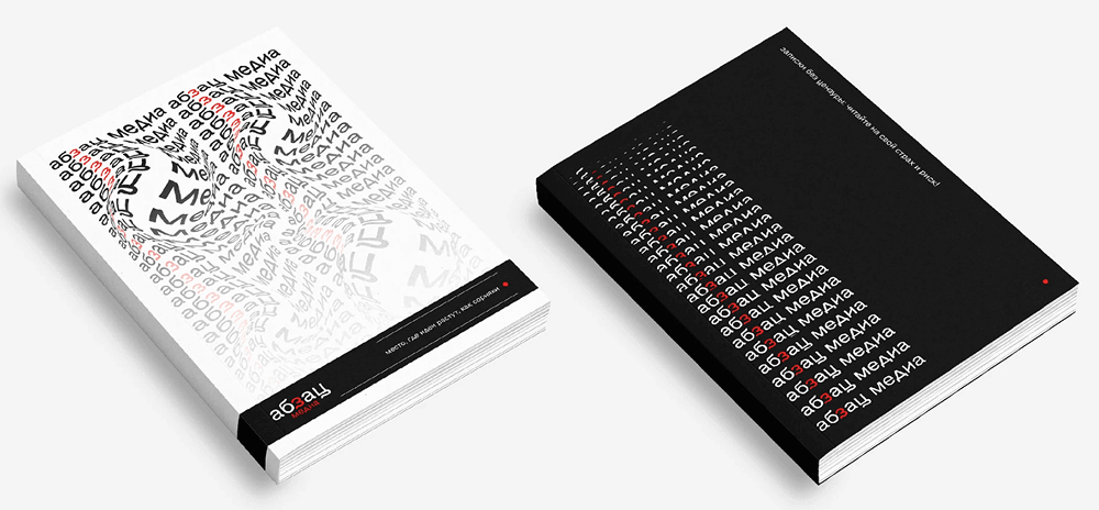 Дизайн мерчовых блокнотов для «Абзац Медиа»: минималистичный дизайн, повторяющийся текст, визуальное искажение.