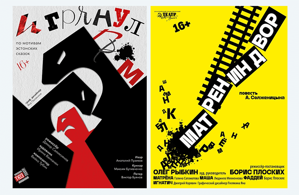 Серия театральных постеров со шрифтовыми композициями, передающими настроение постановки. Дерзкая подача, нарочитая небрежность, динамичность, продуманный хаос.