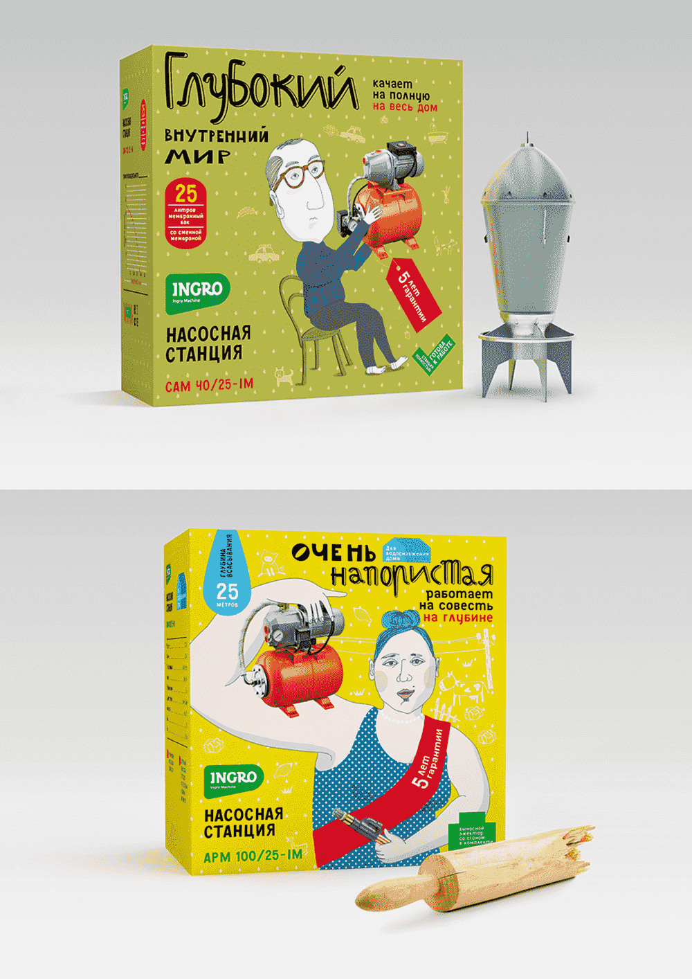 Ироничный дизайн для бренда насосов: неаккуратные рукописные шрифты подчеркивают настроение и придают динамику. Надписей много, и они отличаются по размеру, что создает визуальную иерархию. Понятно, в какой последовательности читать текст.