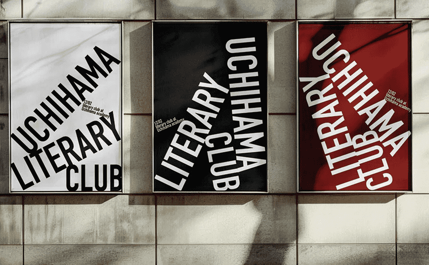 Уличные баннеры с рекламой литературного клуба. Надписи «сложены» друг на друга наподобие книг на полке. Дизайн представлен в трех цветах, и в каждом варианте видим разное расположение текста.