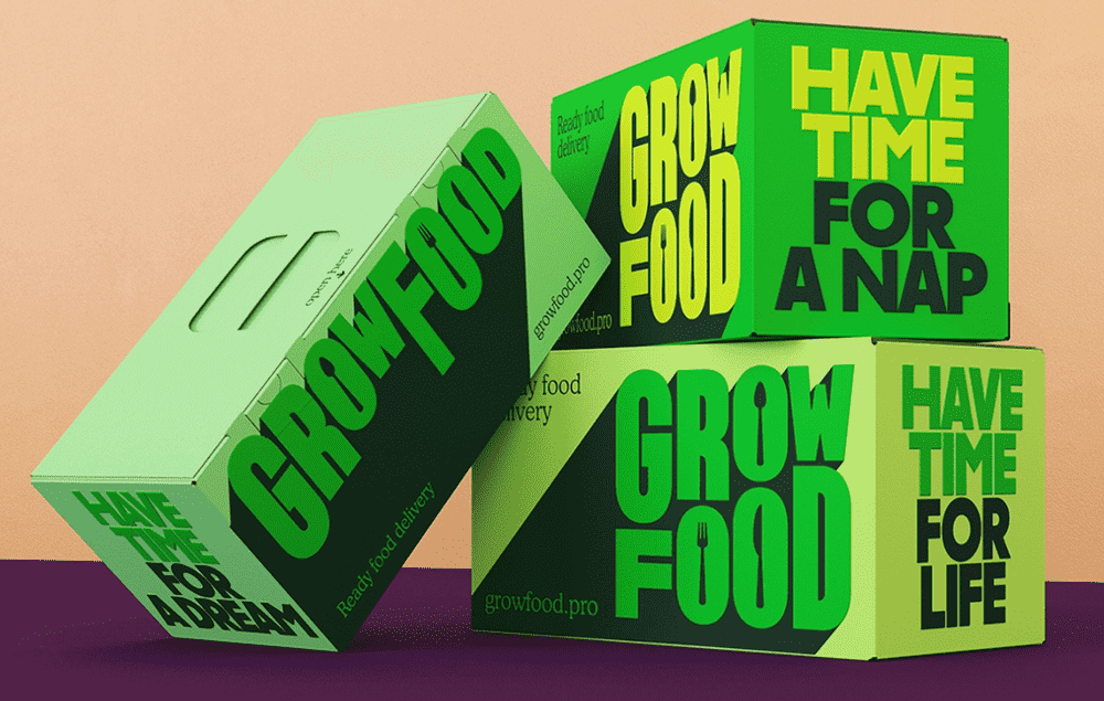 Дизайн Growfood — это лаконичные текстовые композиции в разных цветах, с преобладанием зеленого, чтобы подчеркнуть экологичность, натуральность. Надписи интересны тем, что раскрывают ценности бренда и несут продающий посыл: «Заказывая готовую еду, вы освобождаете время».