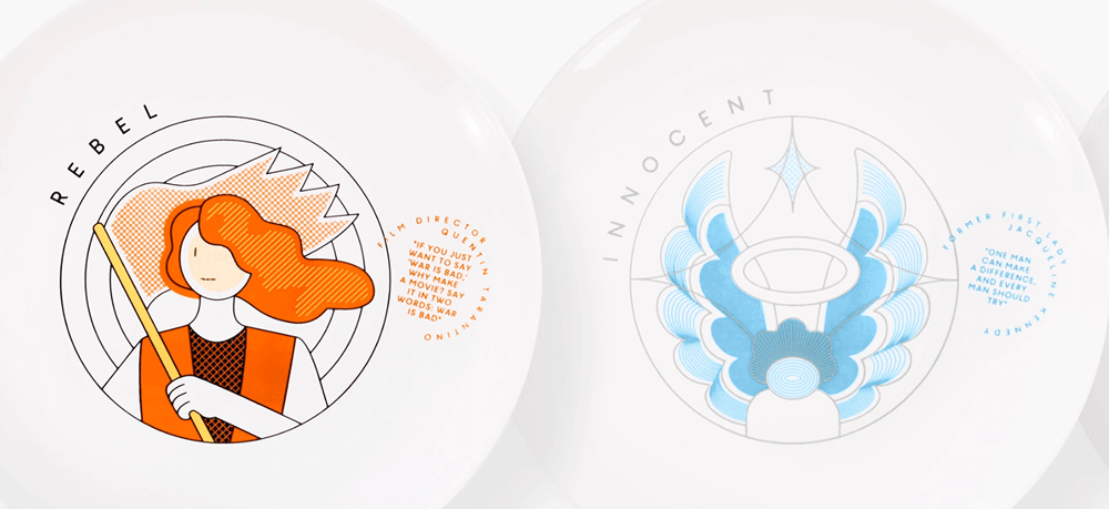 Тарелки «с характером». Справа от картинки — шрифтовая композиция: внутри круга находится цитата, снаружи — имя и статус человека, которому принадлежат эти слова.