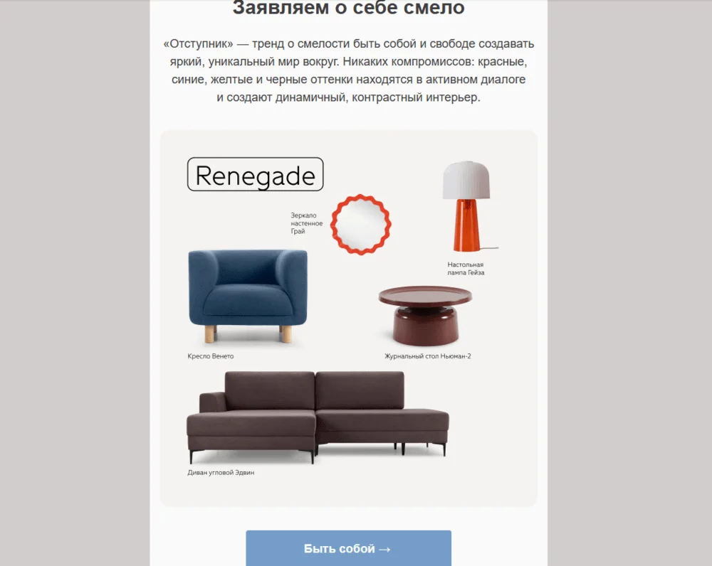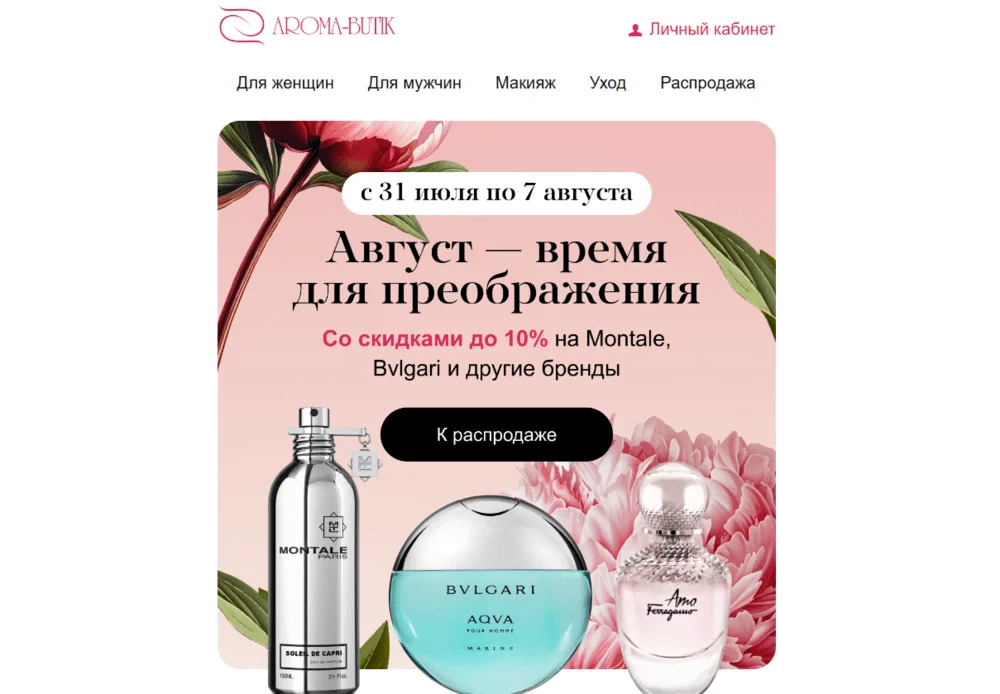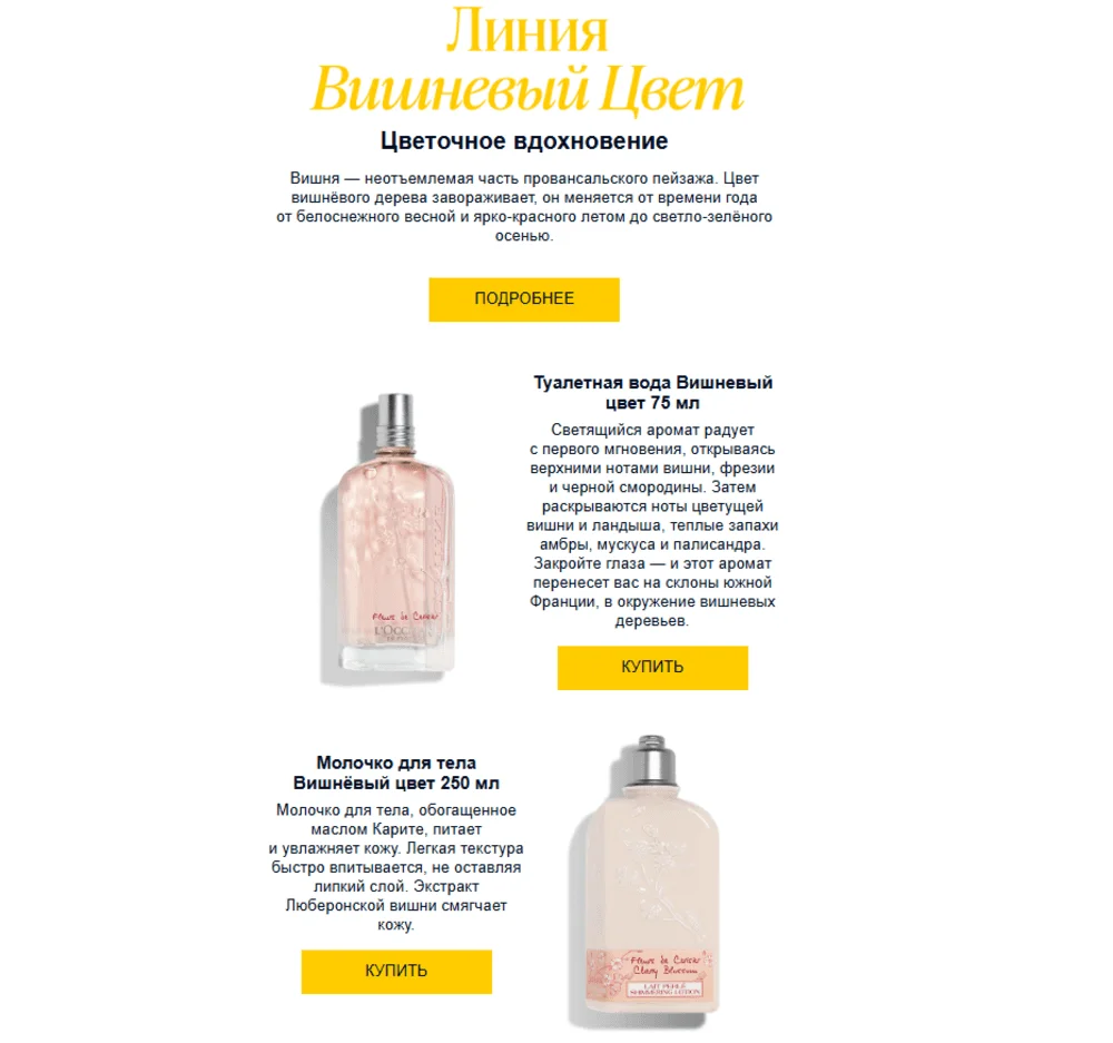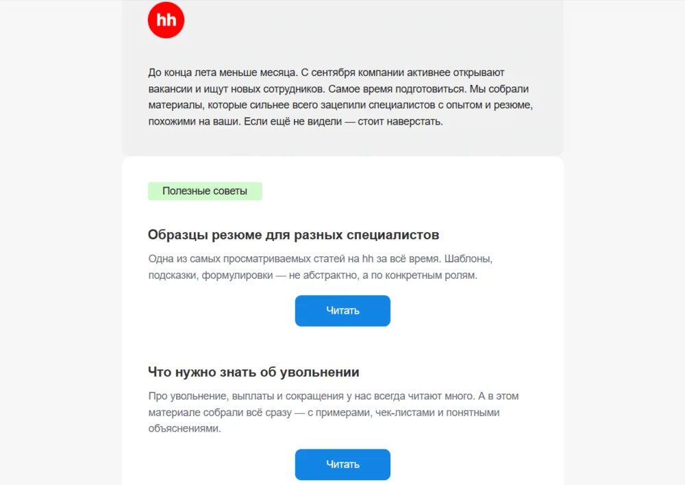 | Кнопка с основным действием находится только внизу письма или дублируется в конце каждого блока. | Главная кнопка отображается на верхнем экране и дублируется внизу, если в письме много блоков. |