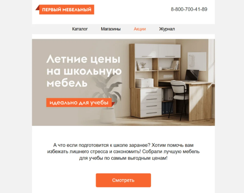 | Письмо с акцией, но кнопка «Получить скидку» расположена в самом низу, после трёх экранов текста и картинок. | Письмо начинается с короткого абзаца и кнопки «Скачать гайд» — прямо в зоне видимости. |
