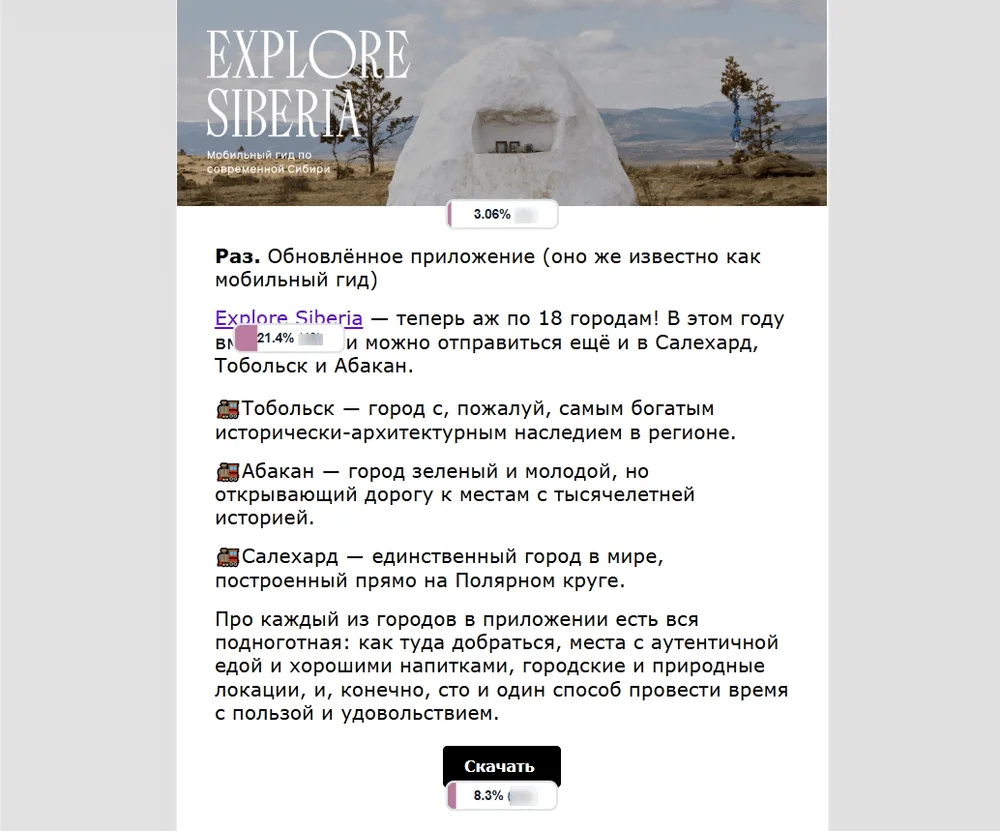 Встроенные инструменты для аналитики есть и в сервисах рассылок. Например, в Unisender есть карта кликов, которая показывает процент и конкретное число пользователей, которые перешли по гиперссылке или нажали на кнопку.