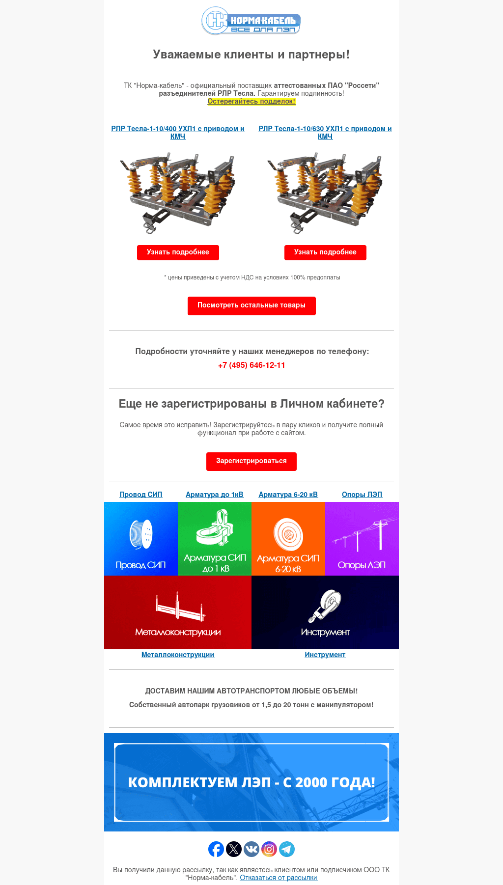 Есть два основных формата рассылок ― типовые и информационные. Типовая представляет собой уведомление клиентов о снижении цен на определенную продукцию. Главных категорий товаров шесть: провод СИП, опоры ЛЭП, арматура до 1 кВ, арматура 6–20 кВ, металлоконструкции, инструменты для монтажа СИП.