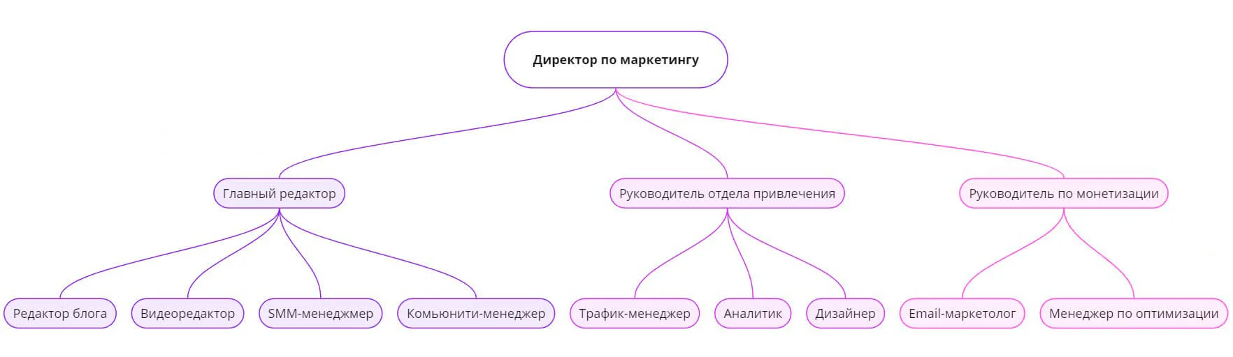 Директор по монетизации — отвечает за увеличение прибыли, полученной от всех интернет-ресурсов, клиентской базы и медиаканалов. Ему подчиняются:
