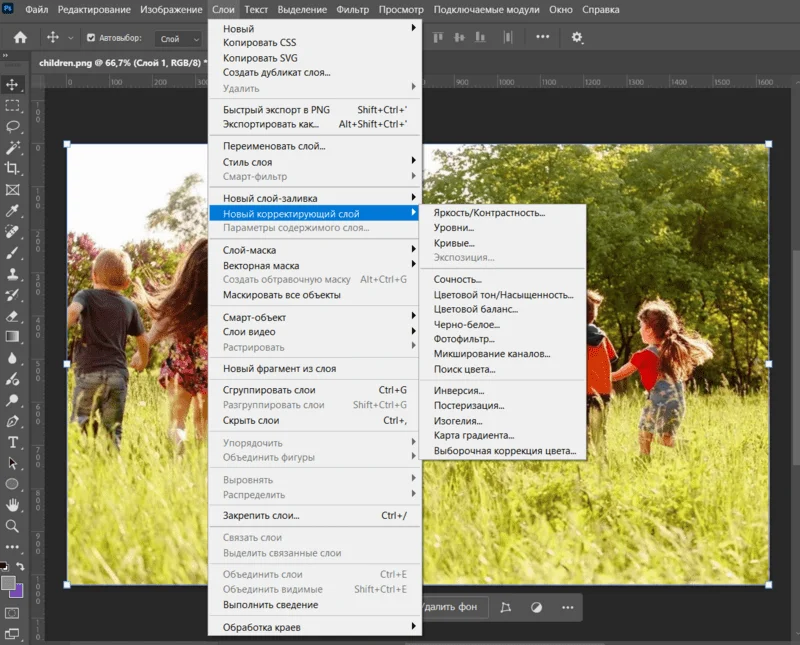 Корректирующие слои (Adjustment Layers). Добавляются через иконку наполовину чёрно-белого круга в панели слоёв или через меню «Слой» → «Новый корректирующий слой» (Layer → New Adjustment Layer). Это цвет, тон, контраст, тонировки и всё, что связано с цветопередачей изображения. Именно корректирующие слои лежат в основе большинства фотоэффектов — от плёнки до киношного цвета.