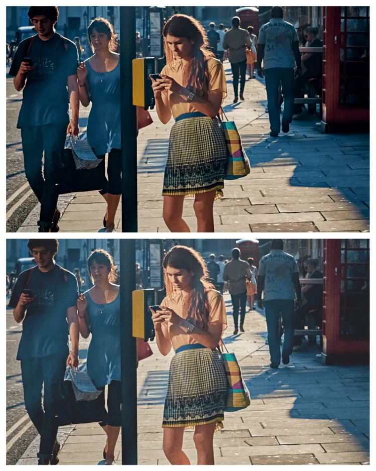 Плёночный эффект. Мягкий контраст, чуть приглушённые тени, лёгкое зерно и тёплый оттенок. Фото становится «атмосферным», будто снятым на плёнку.