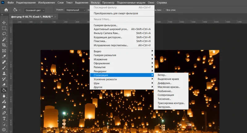 Фильтр (Filters). Находятся в верхнем меню. Это размытия, искажения, шумы и художественные приёмы. Фильтры сильнее меняют исходное изображение, поэтому их лучше применять как «Умные фильтры» (Smart Filters) — так результат можно откорректировать позже.