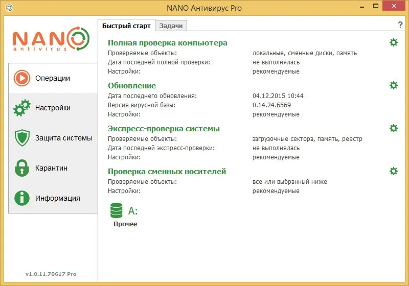 Внешний вид интерфейса NANO Антивирус Pro можно настроить по своему усмотрению. Также есть гибкая настройка режимов работы. Можно создавать собственные задачи сканирования, устанавливать параметры проверки, настраивать запуск проверки по собственному расписанию. Заданные настройки можно защитить от изменений с помощью пароля.