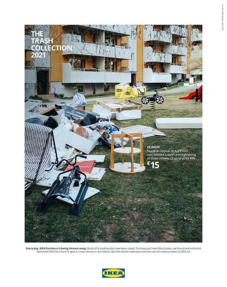 Чтобы изменить это мнение, норвежское подразделение компании объединилось с креативным агентством Try из Осло и запустило проект The Trash Collection. Команда нашла на свалках и улицах страны товары бренда и сделала их героями рекламных роликов и плакатов для наружной рекламы. Вместо привычных идеальных интерьерных снимков мебель представили среди мусора. На плакатах указывали название модели, а также стоимость ее восстановления или цену на вторичном рынке.