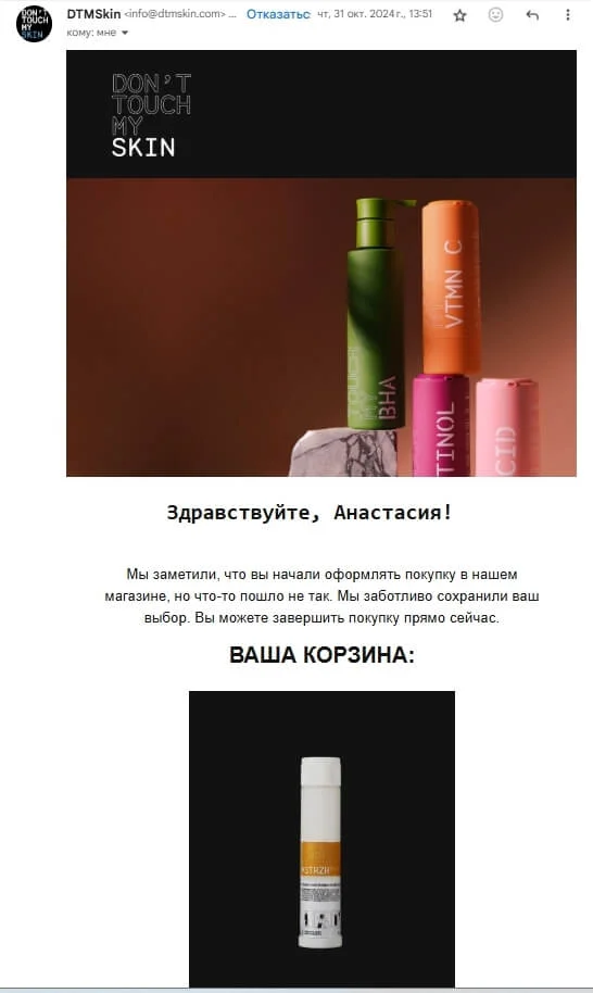 Наращивание продаж. С помощью грамотных писем можно стимулировать повторные покупки, предлагать сопутствующие товары или услуги, продвигать специальные предложения и увеличивать средний чек. А автоматизация позволит, например, напоминать о брошенной корзине — в большинстве каналов такой приём использовать не получится.