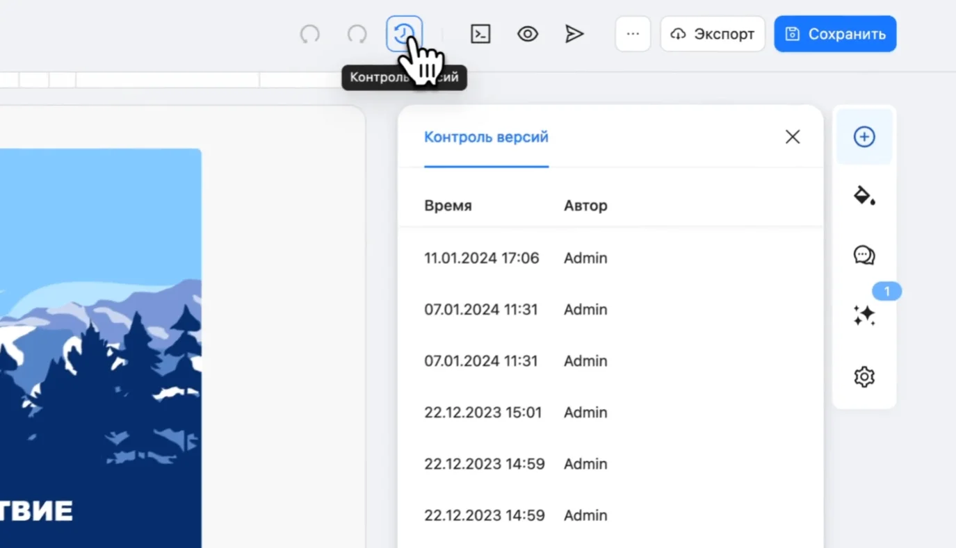 При создании письма все изменения автоматически сохраняются в исходном коде — не нужно бояться, что какие-то правки потеряются. Посмотреть сохраненные версии можно на верхней панели конструктора.