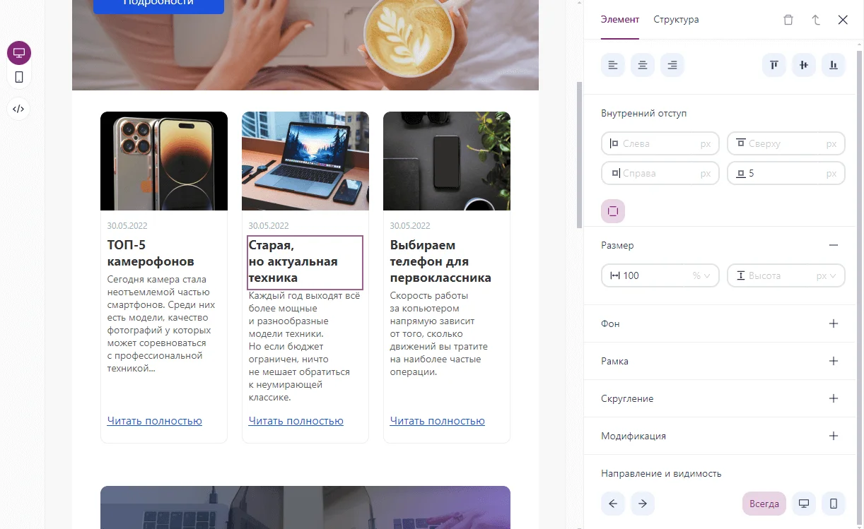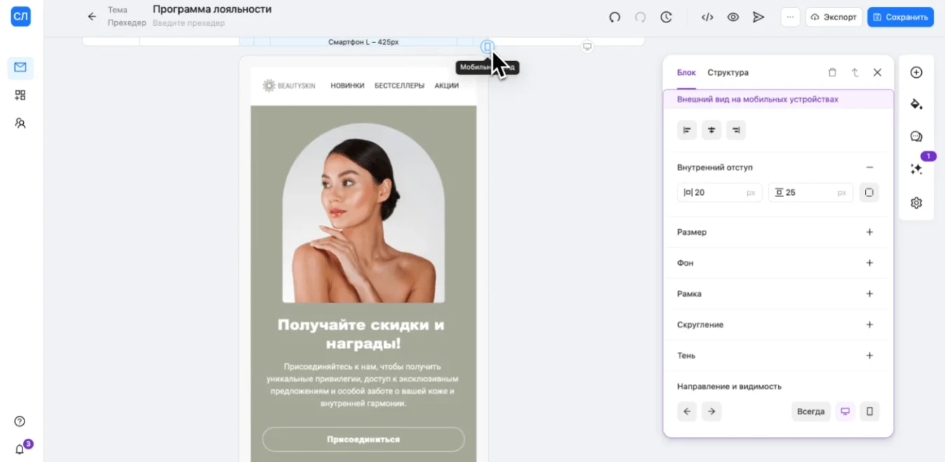 В новом блочнике Unisender можно собирать письма в режиме Mobile First. Чтобы изменить параметры отображения элементов письма, щелкаем по пиктограмме «Мобильный вид» на верхней панели. Затем на правой панели настраиваем размеры, оформление и отображение элементов.