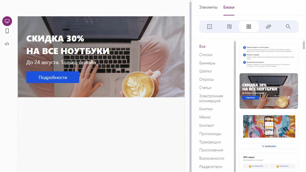 Если вы не разбираетесь в коде, письмо можно собрать из готовых блоков и элементов. Процесс напоминает конструктор Lego: берем готовые детали, соединяем их вместе — получается симпатичный домик. А если нужного блока нет, всегда можно создать его самостоятельно.