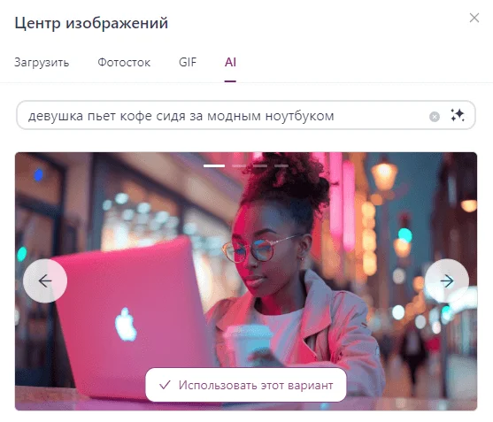 Внутри редактора есть удобный инструмент для поиска картинок — нужно ввести запрос и из предложенных изображений выбрать подходящее.
