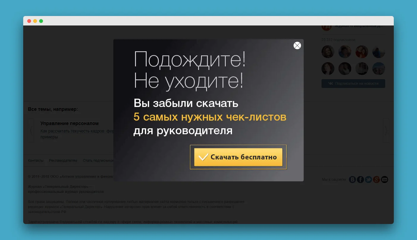 Всплывающие формы для сбора exit-трафика. Похоже на обычную всплывашку, но здесь «вжух!» происходит, когда мы хотим закрыть вкладку браузера.