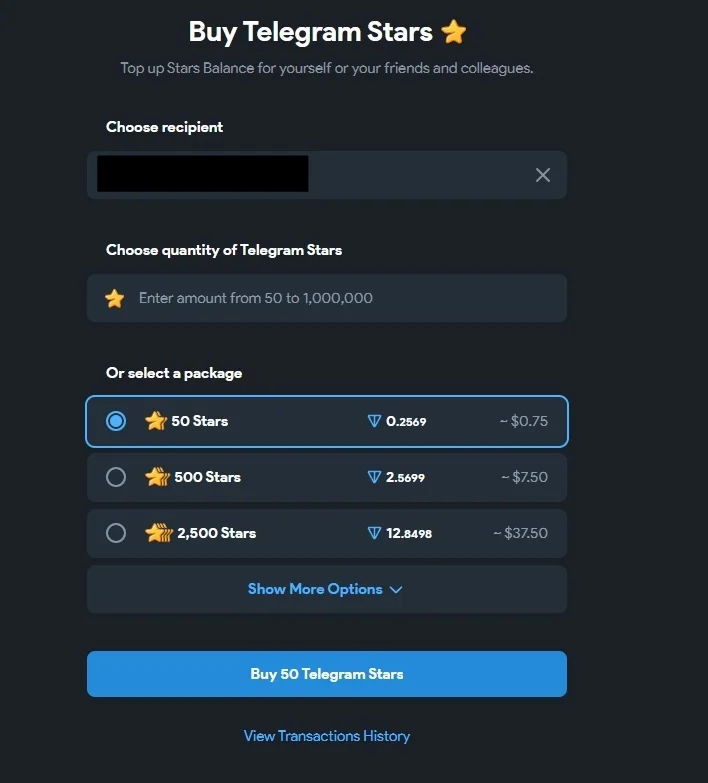 Stars — звезды — внутренняя валюта мессенджера. Вы можете купить набор для себя или для раздачи подписчикам в рамках розыгрыша или конкурса. Также можно выбрать другого получателя и отправить звезды друзьям — для этого достаточно указать нужный юзернейм в графе recipient и выбрать количество от 50 до 1 000 000 звезд.