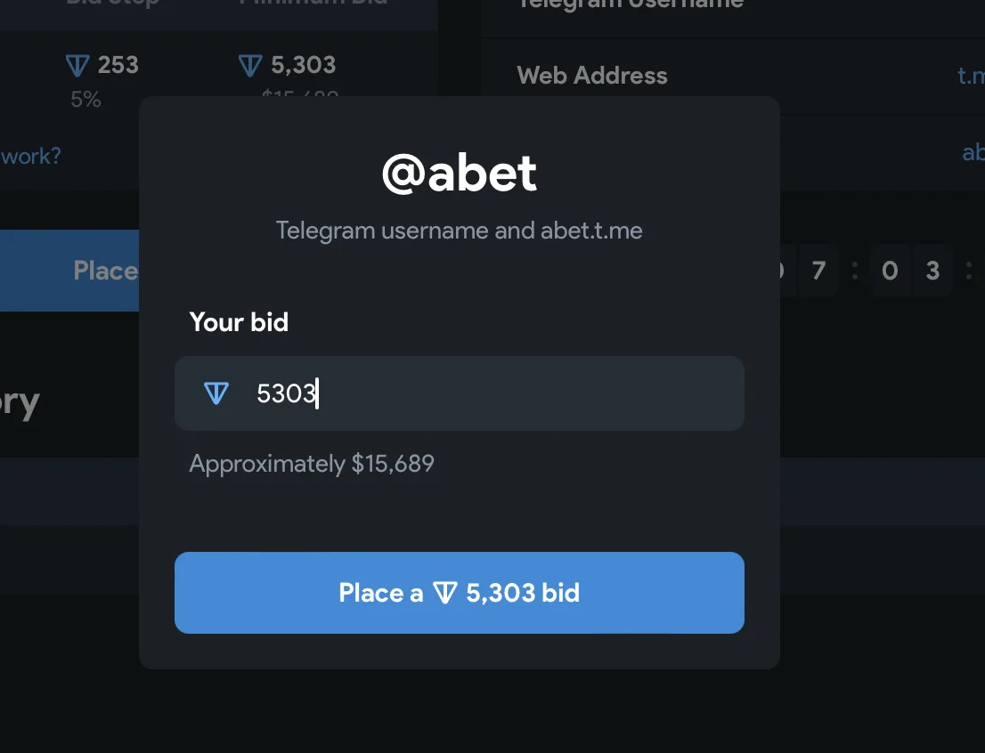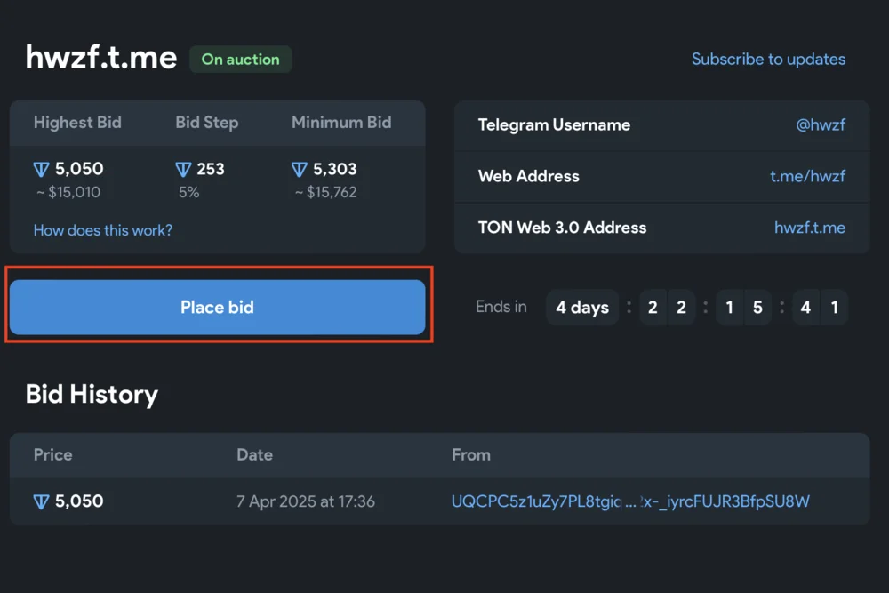 Сделайте первую ставку и подтвердите её в боте. Сумму на кошельке заморозят, а вернут, когда кто-то превысит установленную цену. Платформа заберёт себе 5% комиссии. Если никнейм не заинтересует никого в течение недели, минимальная ставка будет снижаться на 5% каждую последующую неделю.