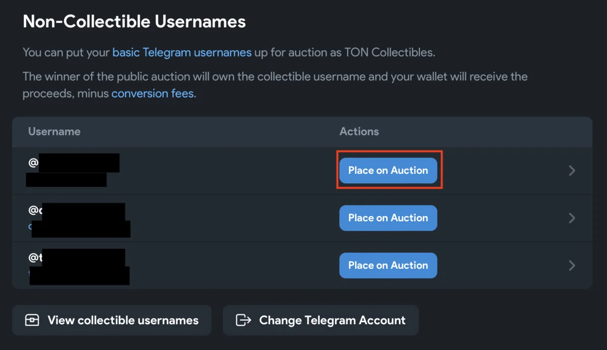 В разделе отображаются все никнеймы, привязанные к профилю. Выберите тот, который хотите продать, и нажмите Place on Auction. Подтвердите действия через бота.