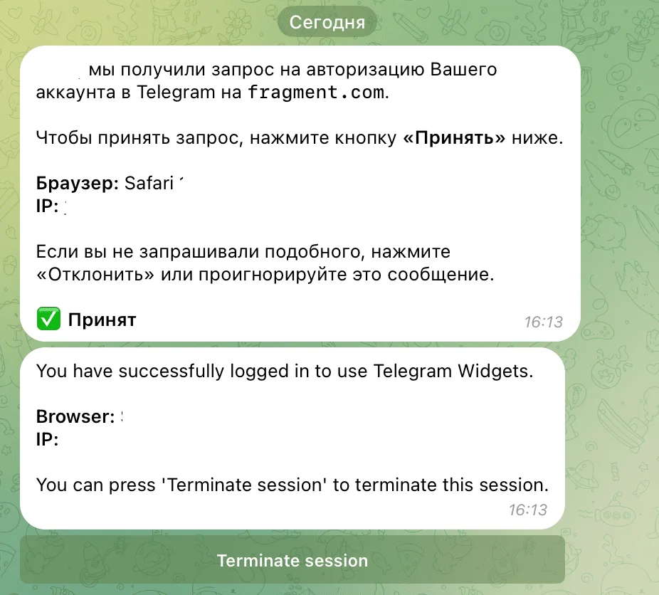 Далее вас перебросит в Telegram-бота Fragment Auction Alerts. Примите в нём все необходимые соглашения на участие в аукционе и подключите двухфакторную идентификацию аккаунта, если ещё этого не сделали. Бот будет присылать уведомления по сделке, например, сообщит, что кто-то перебил вашу ставку.