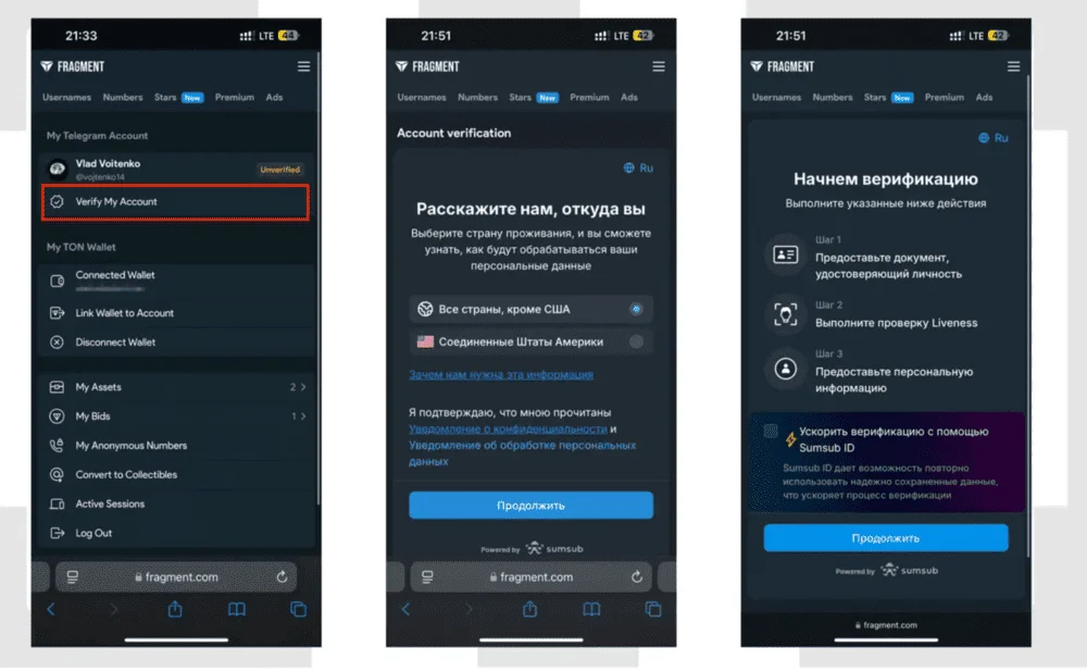 В ноябре 2024 года все пользователи платформы Telegram должны пройти подтверждение личности. Верификация необходима для совершения покупок, размещения лотов на маркетплейсе. Ее требуется пройти один раз, но в некоторых случаях могут запросить повторно, например, при покупке номера.