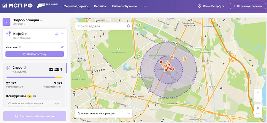 На Цифровой платформе МСП.РФ есть полезный инструмент — «Оценка рынка и расчет бизнес-плана». Можно выбрать интересующее направление бизнеса, поставить одну или несколько точек на карте и получить относительно точные данные по рынку.