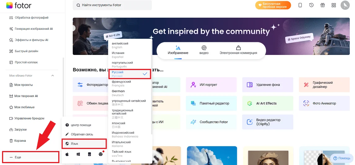 Сразу кликните по ссылке «Еще» в левом нижнем углу, перейдите в раздел «Язык» и выберите русский, чтобы быстро находить все нужные инструменты в интерфейсе.