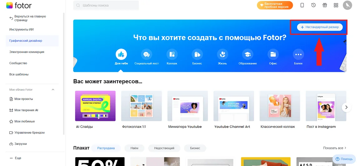Чтобы создать графику с нуля или на основе готового шаблона, перейдите в раздел «Графический дизайнер». Здесь находятся все макеты, а в верхней части интерфейса, в разделе «Для тебя» отображается персональная подборка. Я выбрала в настройках роль «Владелец бизнеса/предприниматель», поэтому Fotor показывает сначала дизайны для соцсетей, шаблоны плакатов, презентаций, отчетов, логотипов и визиток.